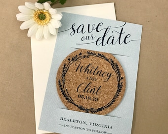 Light Blue and Navy Whimsical Wreath Cork Coaster Save the Dates // Engagement photo modern script drink coaster save the date