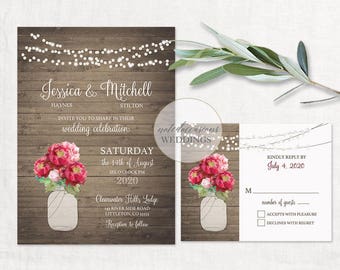 Printable Wedding Invitation Suite Mason Jar Wedding Invitation Templates Rustic Floral Red Peony DIY Wedding Invite Boho Wedding Invitation