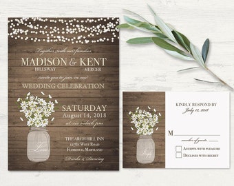 Rustic Wedding Invitations Mason Jar Wedding Invitation Printable set RSVP Daisy Wedding Country Barn Wood lights Digital Template DIY