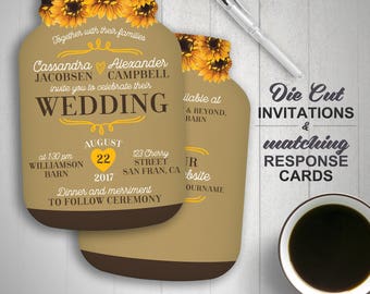 Sunflower wedding invitation, Mason Jar Wedding Invitations, Mason Jar shaped cards, Country Wedding, Printed Wedding Invitations, rustic