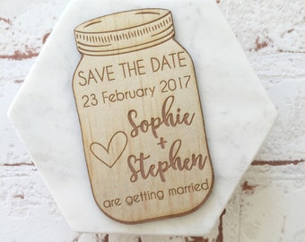 Save the date - Rustic Wedding Invite: Australian made Wood/timber engraved Mason Jar save the date magnet