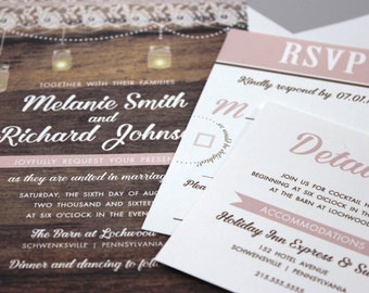 Rustic Wedding Invitations, Faux Wood Wedding, Rustic Mason Jar Wedding Invitations, Lace and Wood Wedding Invitations