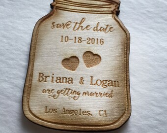 50 Mason Jar Save the Date Engraved Magnets - engraved in wood