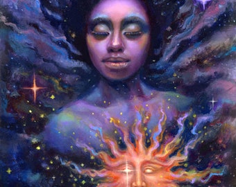 with a combination of acrylic paint, paper art and a bit of sparkle, this piece will add a special bit of magic to a very special space.