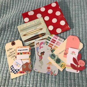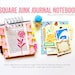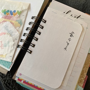 Materials: hand stamped pages, vintage book pages, guest checks, library checkout cards, shipping tags, sturdy chipboard covers, envelopes, lined and colored index cards, cardstock and patterned paper, spiral binding, office ephemera, colored lined notepaper