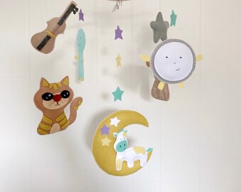 "Hey diddle diddle, the cat and the fiddle, The cow jumped over the moon. The little dog laughed to see such fun And the dish ran away with the spoon! " Well... the cow TRIED to jump over the moon! Capture and delight all who set their eyes on this imaginative nursery mobile! Sure to bring a smile to everyone's face!