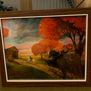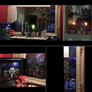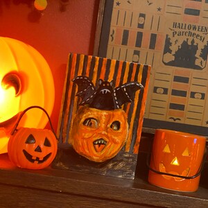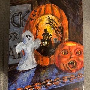 I had great communication with Laura, she shipped quickly. Her beautiful package arrived safely with thoughtful, personal and special Halloween extras! I am thrilled with everything! Each of her pieces has the Halloween nostalgia I crave. They are even more vibrant in person! I had plans to create a gallery wall with all of her work. However, I am having too much fun creating little vignettes! I will be back for more!🎃👻🧟♀️🕸