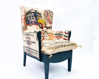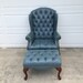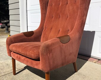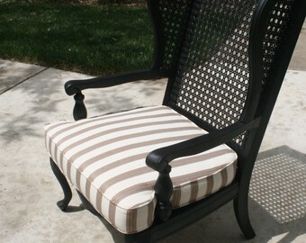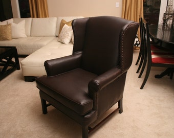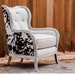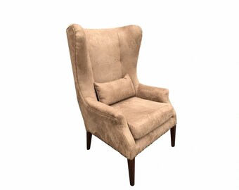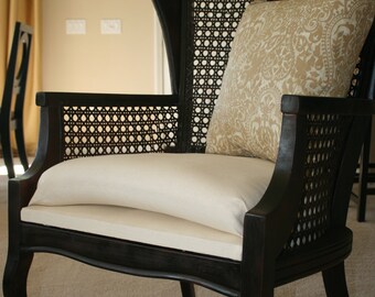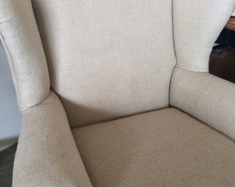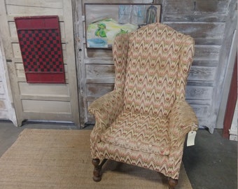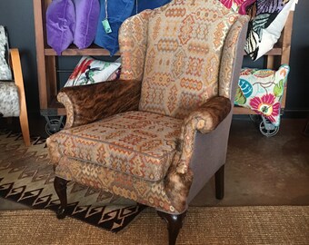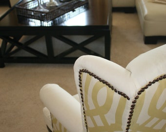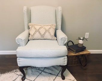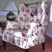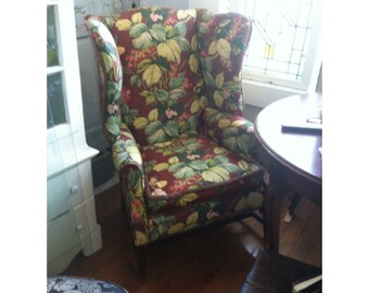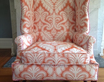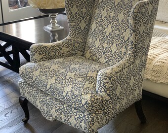 AVAILABLE FOR CUSTOM ORDER. This wing back chair features embroidered fabric upholstery and linen.