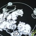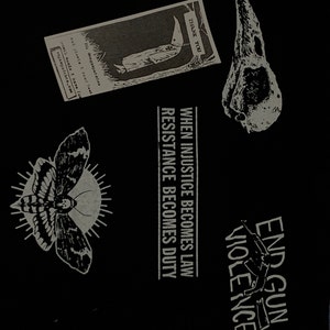Black ink, on beige / cream / off white fabric, sized about 5.5 wide by 4.5 tall. I drew this also, so this is FAN ART of an anarchist turtle, ripping it hard, and tossing the cross, as it were.