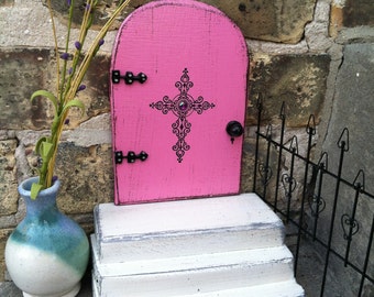This little door is only 6X4 inches and ¼ inch thick so it lays almost flush with any surface to make it look like its part of the structure and distressed to make it as if its been there for years. The entire piece is hand crafted in my basement workshop. I cut, sand,paint and distress all my fairy doors by hand. Several coats of polyurethane are then applied to protect it from outside elements. I also make the hardware by hand and then paint it.. Included with your fairy door is a piece of non-toxic reusable putty so you will not damage your trees and walls.