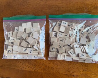 Lot of 100 Vintage Wood Scrabble Tiles In Storage Bag - Jewelry Pendant Supplies