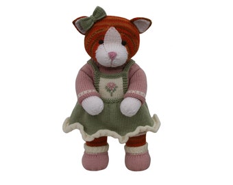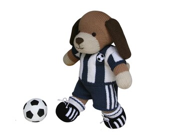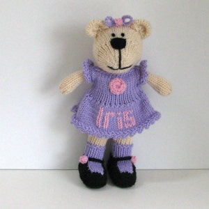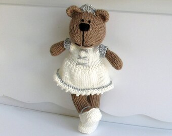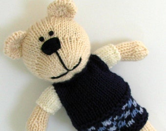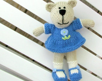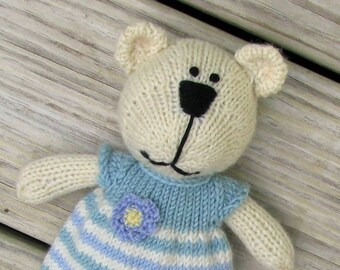 This adorable hand knitted teddy bear is soft and cuddly.