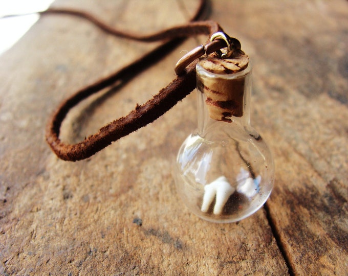 Necklace. Raccoon Tooth in Miniature Jar on Leather Chain