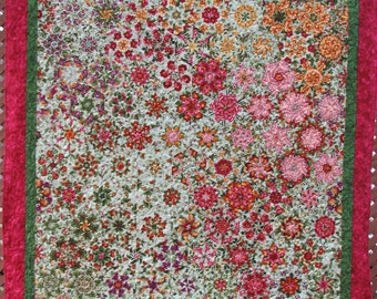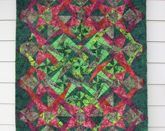 The quilted Wall hanging is machine pieced and quilted 36"x45". The colorful spiky flower blocks, partially foundation pieced float on a back drop created with leafy green blocks. It received a blue ribbon at the Warren County Fair.