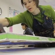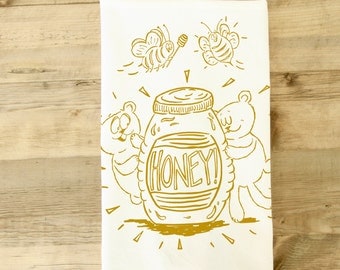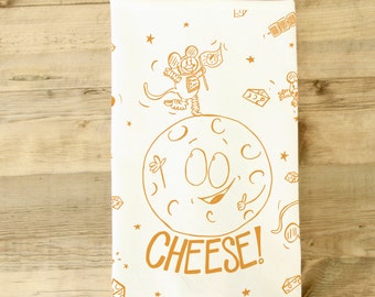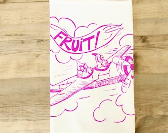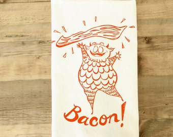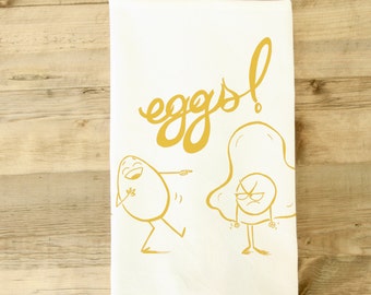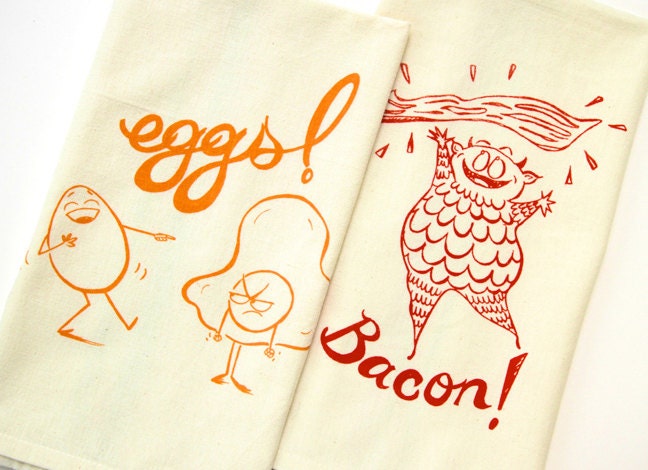 They're hand-screenprinted in water based non-toxic fabric ink. Bacon comes on a super fun rainbow striped towel and eggs is on an awesome yellow and green striped one. He's one of my many illustrated funny food characters.