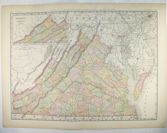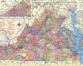 Large Vintage Virginia Map - 1970s Reproduction of 1848 State Map