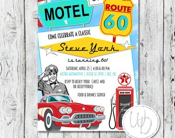 Car Birthday Invitation, Auto Birthday Invitation, 1950s Birthday Invitation, Retro Birthday Invitation, Route 66 Birthday Invitation
