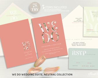 We Do, Wedding Invitation Set, Printable Templates, 5 items, Coral, Gardenia and Sage Suite, TRY Before you Buy