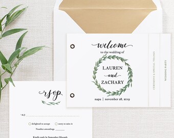 Booklet Invitation Set, Printable Wedding Invitation Template, DIY Wedding Cards, Editable PDF Instant Download Rustic Wreath #SPP032wib