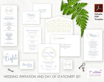 Wedding Invitation Template, Printable Blue and gold Wedding Invitation Set, Printable Invitations, Editable Invitations