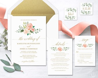 Peach Blush Floral Wedding Invitation Set, Printable Wedding Invitation Card Template, Editable, Elegant, Calligraphy, Peach, Gold, VW27