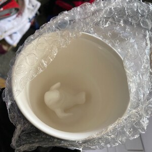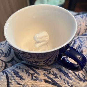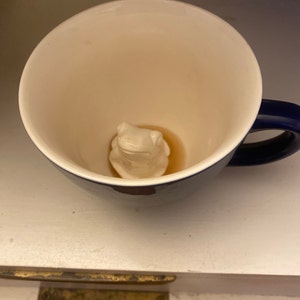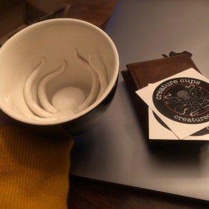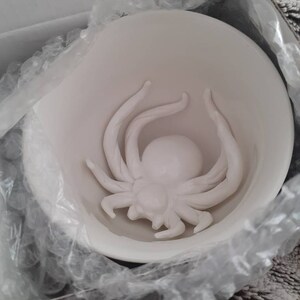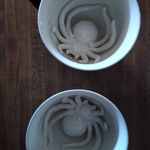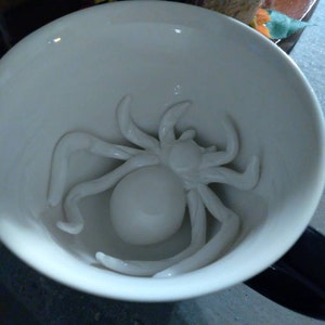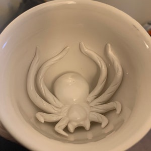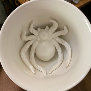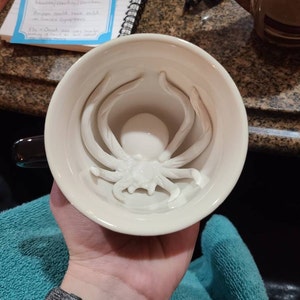 As you drink the Spider will emerge. Cups are handmade, dishwasher safe, microwavable, and hold 11 oz. Black exterior glaze.
