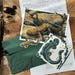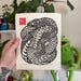 A 5"x7" linocut of a python among floral designs, hand printed on pages of a 1938 math textbook.