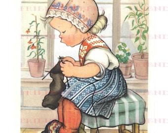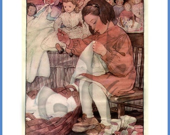 Vintage Framed Print Illustration - Girl Sewing - A Stitch In Time - Ars Sacra Herbert Dubler