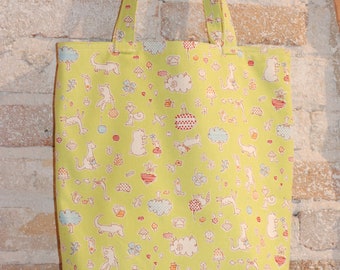 Use this for toting anything from gym clothes to books. The laminated cotton fabric is lightweight yet sturdy and the lining fabric is 100% cotton. Both prints used are delightful.