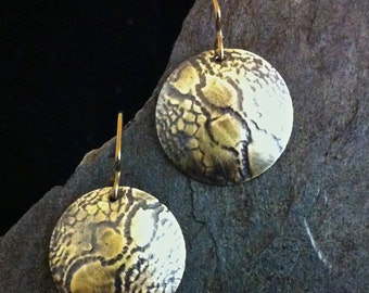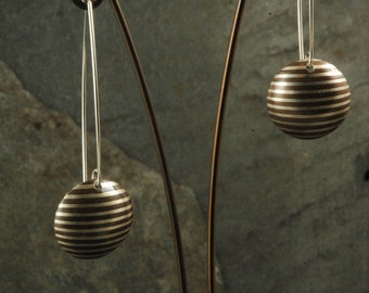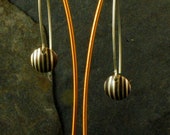 These 1/4" circles are on a long ear wire to give them understated elegance. They have been deeply domed with hammer and dapping block by hand, then they are given a light scratch brush finish.The copper has been treated with a chemical patina, or oxidizer, to bring out the contrast in the design and color it a rich brown. They have been waxed with multiple layers of wax to keep the silver bright, The sterling wires give them a total of almost 2" in length. They are extremely light which makes them easy to wear.