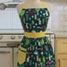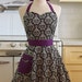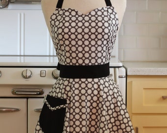 This is a very cute vintage inspired full apron with a sweetheart neckline! This apron has graphic condiment bottles on a brown background. The pocket and straps are red with white polka dot.
