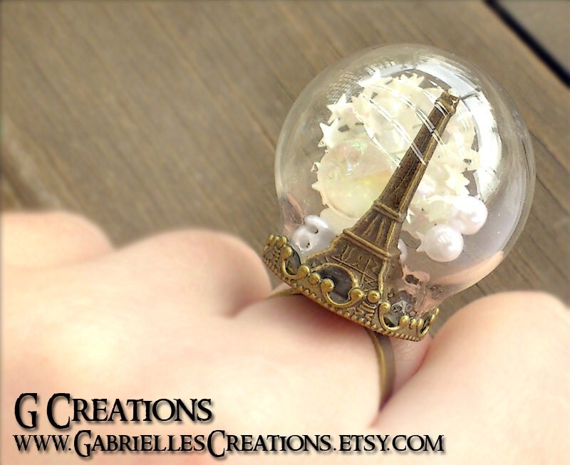Eiffel Tower Globe Ring Christmas gift - Paris Snow Globe Glass Jewelry - Bronze Crown Ring - Glass Dome Romantic Ring - Terrarium