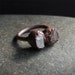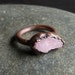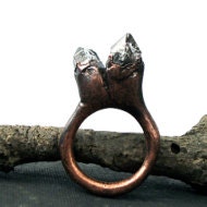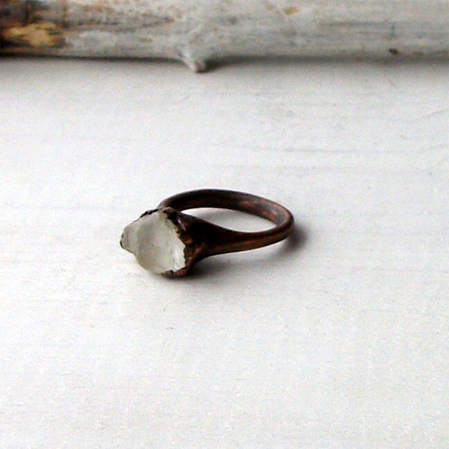 This gemstone ring features a frosted, white pebble of lovely topaz. It has been electroformed to follow the contours of the stone. Copper band has been treated with LOS, sealed with Renaissance Wax and has a matte finish.