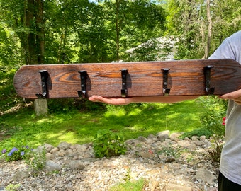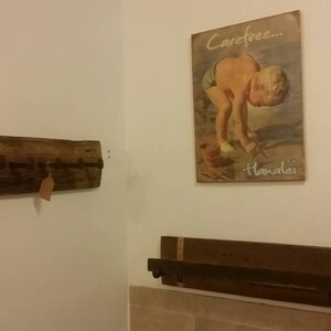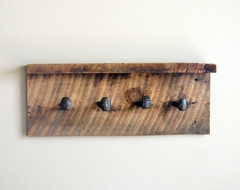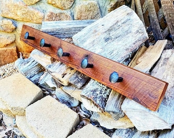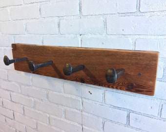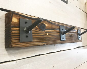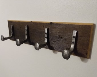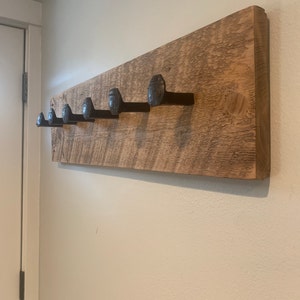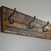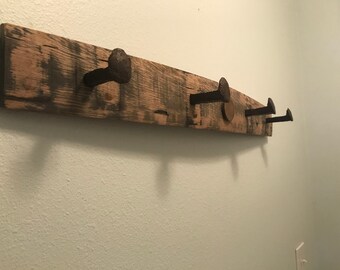 See moreRustic coat rack. Barn wood wall hanger. Railroad spike hooks. Reclaimed wood towel rack.