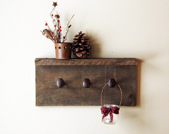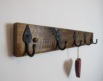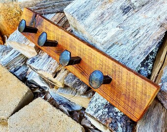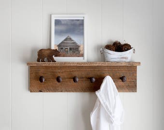 Rustic wall rack is handmade with reclaimed barn wood, with six hooks made from authentic railroad spikes. A wonderful addition to your living room, entry hall or any space you'd like to add a special rustic touch. Extremely sturdy - can be used to hang coat, hats, towels, bags and much more! Personalize this with family name, favorite saying or graphic!