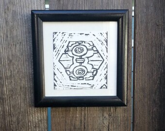 Companion Cube Black and White Linocut Print in Black Frame