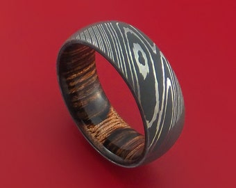 Damascus Steel Ring with Heritage Brown Hardwood Interior Sleeve Custom Made