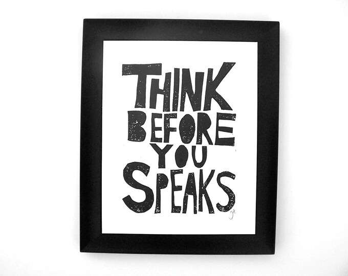 PRINT - think before you speaks BLACK linocut typography poster 8x10