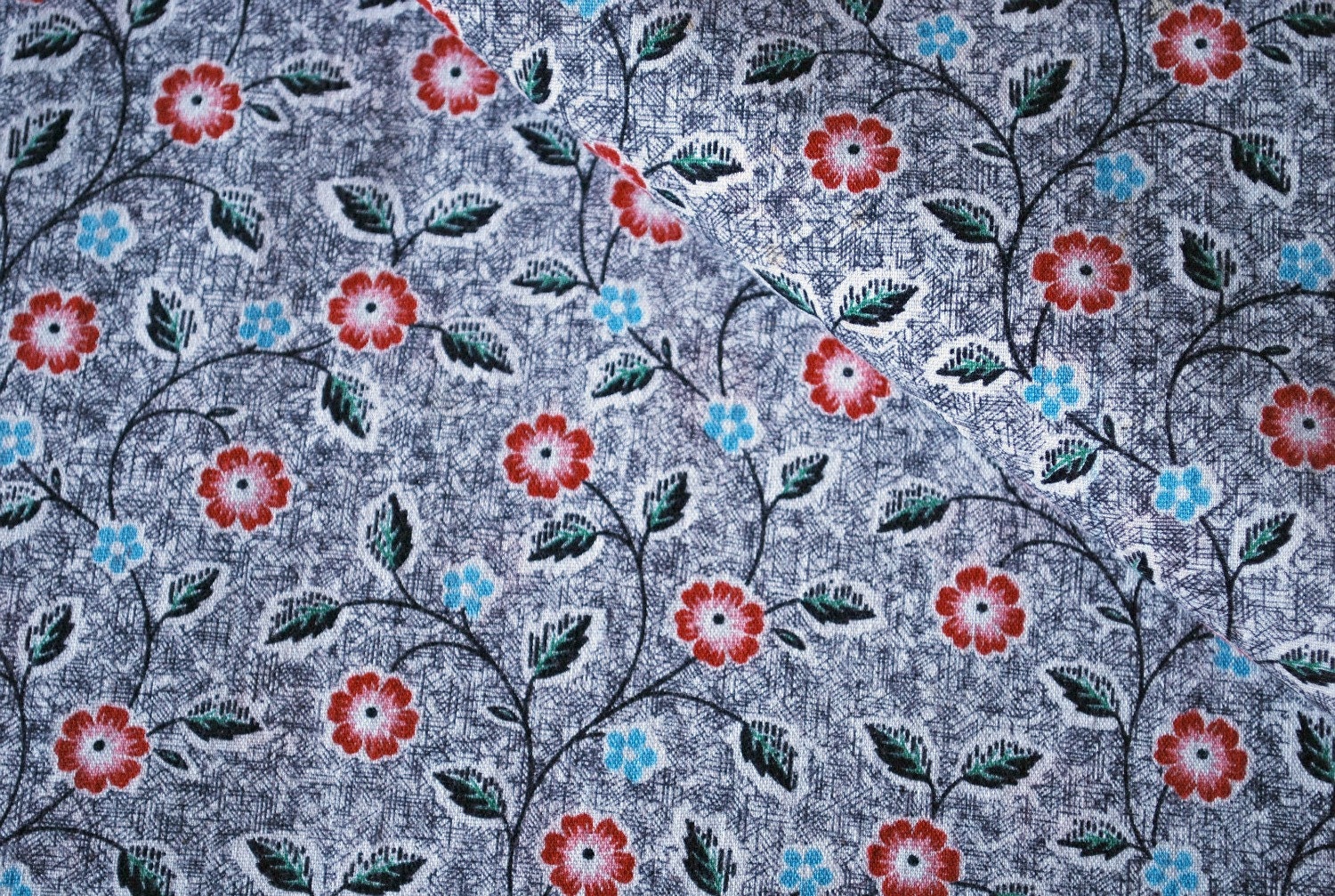 Vintage Fabric Red and Blue Flowers on Gray Scratch Pattern