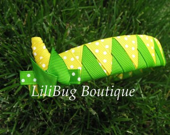 The plastic unbreakable headband measures 1-inch wide & has been woven with Apple Green and Emerald Green grosgrain ribbon.