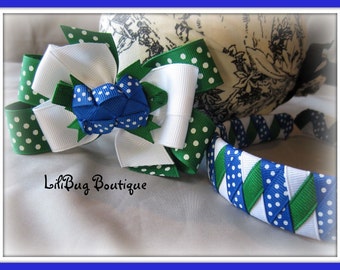 In this set, you will receive one hairbow and one headband as specified below. The great thing about it is the bow can be worn on the headband or seperate-very versatile!!