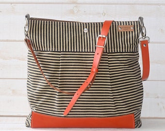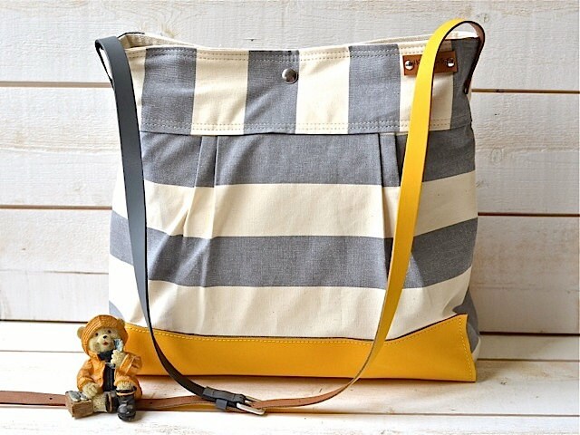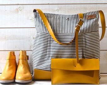 BEST SELLER Diaper bag / Messenger bag STOCKHOLM Gray geometric nautical striped Mustard Leather -
