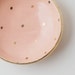 This hand made dish is carefully decorated with 18 karat gold spots in a grid pattern and finished with a layer of gold leaf on the bottom and edges. At 3 inches across, it fits comfortably in the palm of your hand. Use it to keep rings and other precious items safe and stylish.