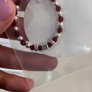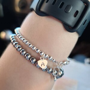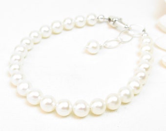 This personalized real pearl bracelet for your flower girl is created with Grade-A 5.5mm freshwater pearls. Her initial will be hand stamped onto a sterling silver heart charm (4 fonts to choose from). You choose the location of the charm: front and center, off-center, or near the clasp. Includes a sterling silver heart-shaped lobster clasp with a 1/2" "Grow with Me" extender chain.