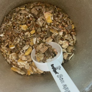 Composition: buckwheat, millet mixture, canary seed, amaranth, grass seed mixture, sesame, brown perilla, milk thistle, linseed, safflower, chicory seed, raspberry seed, nettle seed, rosehip seeds, gammarus, calendula, hibiscus blossoms, cornflower red, cornflower blue, peppermint, lemon balm, chamomile