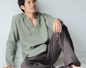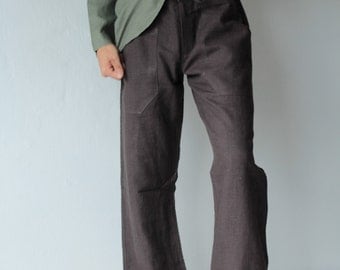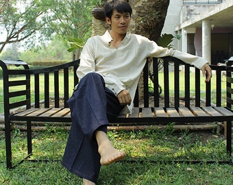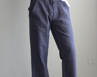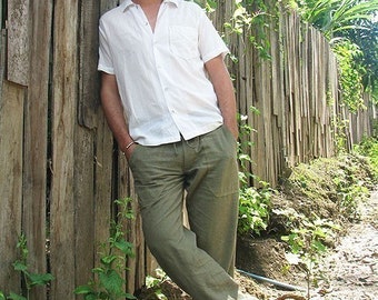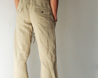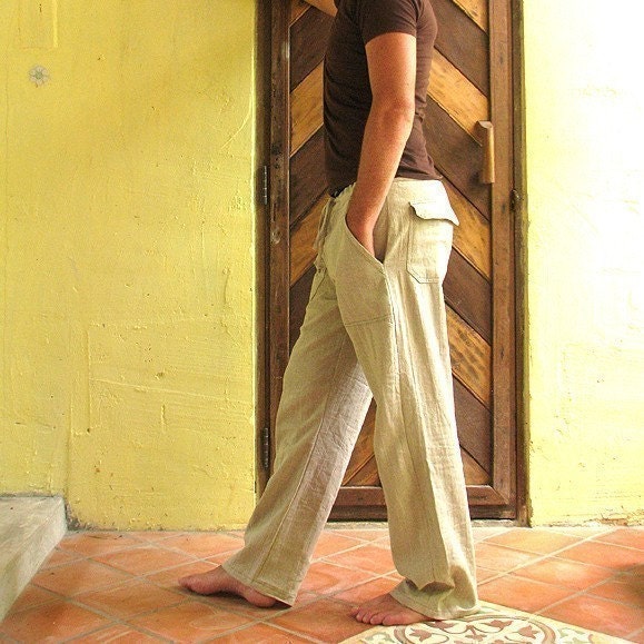 These pants are a simple design made from 100% natural hemp fabric. The fabric is unbleached, un dyed and has a very natural feel.