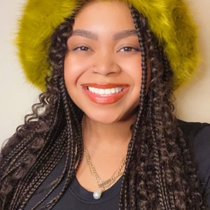 This hat is by far one of my favorite accessories. It’s such a fun statement piece. The green color is so vibrant and the faux fur is so soft and supple. It also has a sheen to it. I’ve touched other hats where the fur felt/ looked dry and coarse. This hat exceeded my expectations and I’m so happy to finally have it. It is definitely worth the money. I wore it for the first time to the museum and was complimented at least 10 Times while out and about. I even sent a few links to the seller’s website. Such a great buy! I felt to cool and beautiful wearing it. I’ve been smiling all day.