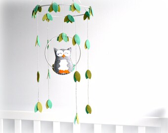 Owl mobile - woodland - Nursery baby mobile - Felt green, brown and red owl - Nursery decor - MADE TO ORDER