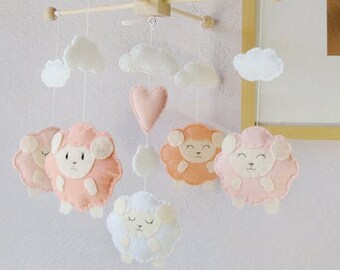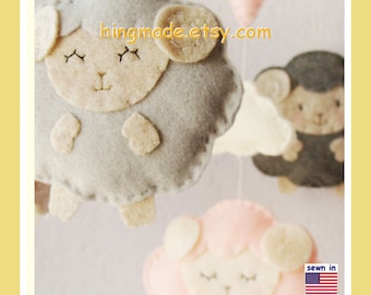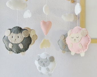 Baby Mobile: Pastel Colors Little Lamb with Pink Heart Theme, Gender Neutral Nursery Decor. Baby Pink Powder Blue Granite White
