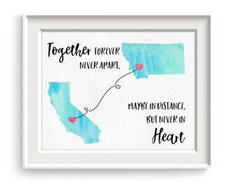 Together forever never apart, maybe in distance but never in heart, watercolor states long distance print